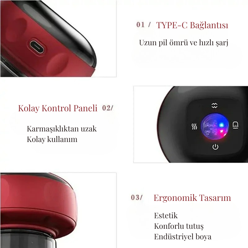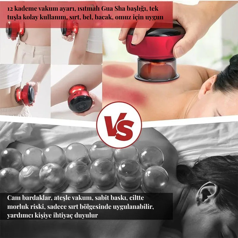 Isıtmalı, titreşimli ve 12 kademeli ayarlanabilir vakum teknolojisiyle modern kupa terapisi. Lenf drenajı, kas gevşemesi ve şekillendirme bir arada
